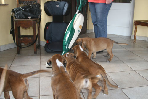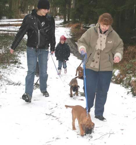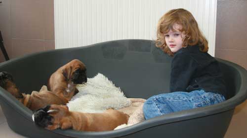 Die Welpen wachsen im Haus auf und haben vollen Familienanschuß, d.h. sie sind auch kleine Kinder gewöhnt. Außerdem können sie sich in unserem 2700 m² großen Garten austoben.